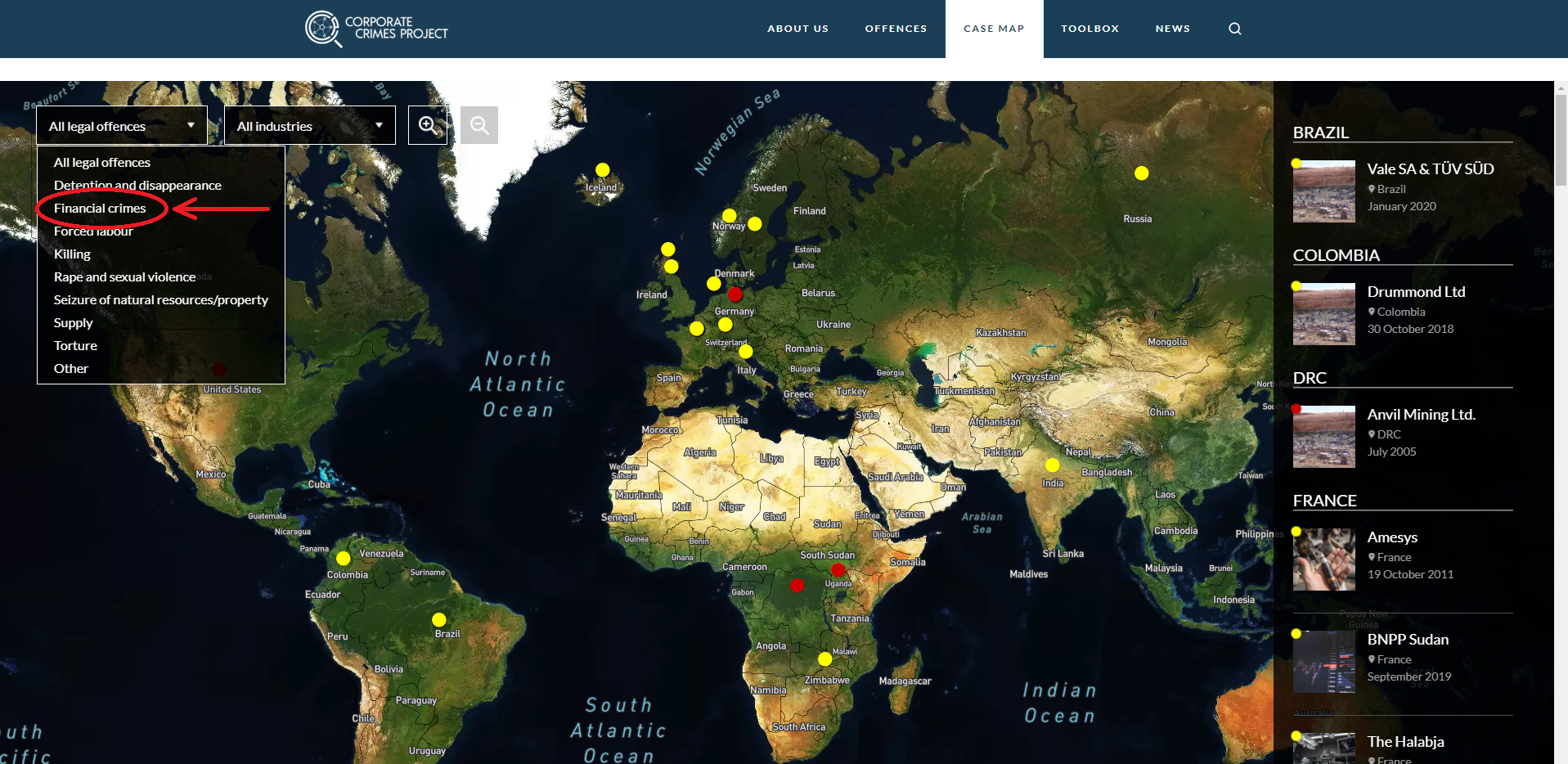 Corporate actors have been involved in many cases where a financial crime was one or more of the underlying alleged crimes. To find out more, visit our Case Map, and under the first search criteria (“All legal offences”), select “Economic crimes” as shown below. The case results will provide you with a list of criminal cases involving corporate actors accused of committing one or more financial crimes.