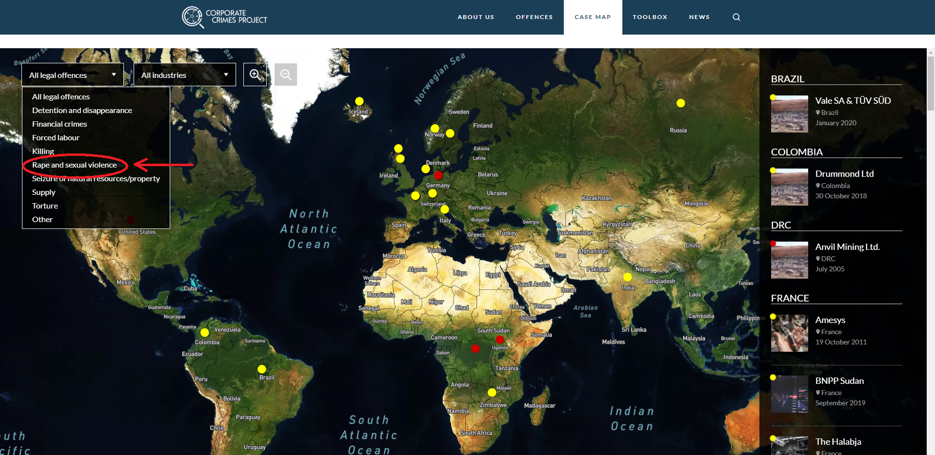 Corporate actors have been involved in many cases where rape or sexual violence was one of the underlying alleged crimes. To find out more, visit our Case Map, and under the first search criteria (“All legal offences”), select “Rape and sexual violence” as shown below. The case results will provide you with a list of criminal cases involving corporate actors accused of committing rape or sexual violence.
