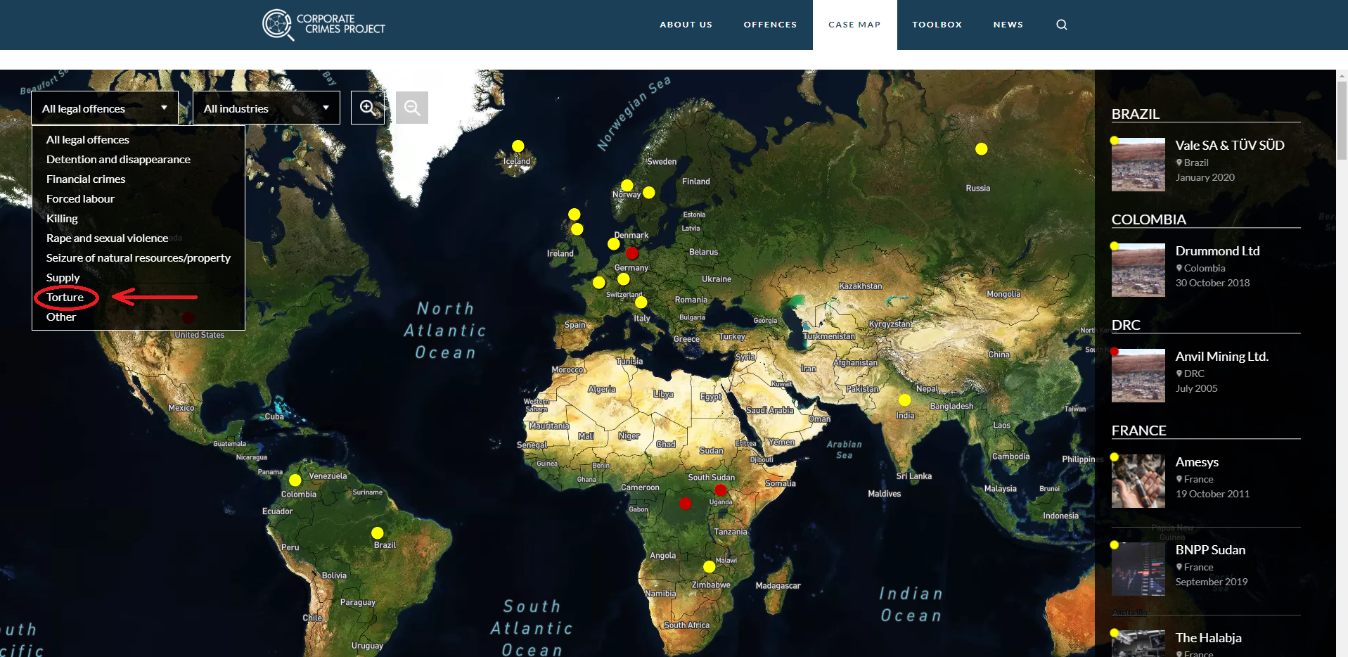 Corporate actors have been involved in many cases where torture was one of the underlying alleged crimes. To find out more, visit our Case Map, and under the first search criteria (“All legal offences”), select “Torture” as shown below. The case results will provide you with a list of criminal cases involving corporate actors accused of committing torture.